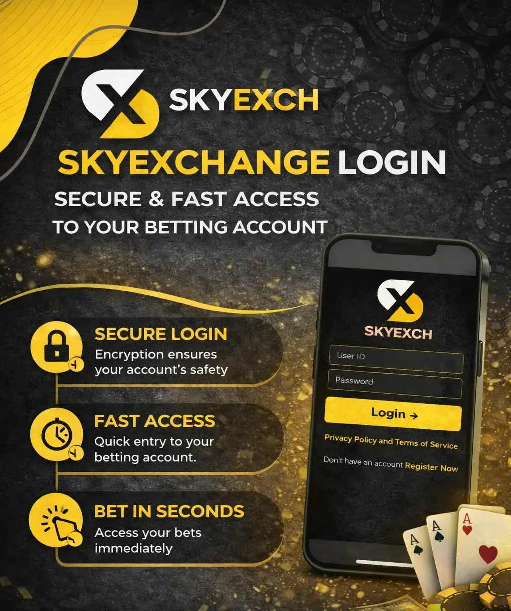 Your personal account is a Sky Exchange ID that allows you to access sports betting, casino games, and additional online services. You cannot use the platform or log in without this ID.